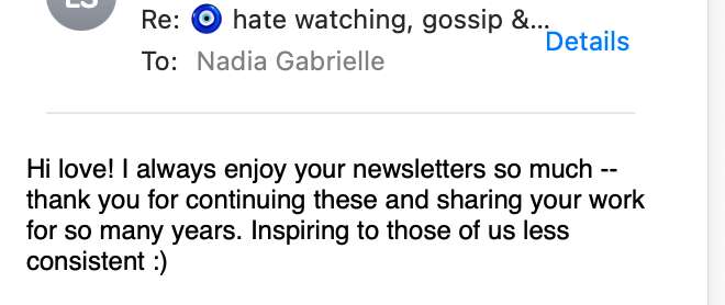 Gone were the days of Carrie Bradshaw-esque (metaphorical) hiding in front my laptop screen, and begun had the era of 💌 monthly Nadia Gabrielle newsletters – still going strong, almost six years later.